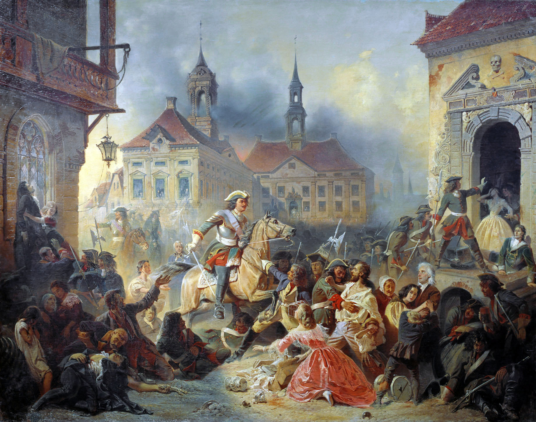 Петр I усмиряет ожесточенных солдат своих при взятии Нарвы в 1704 году Художник: Зауервейд, Николай Александрович (1782—1844) 169.7 x 214.8 см Холст, масло 1859 Государственная Третьяковская галерея Москва Фрагмент. Смотреть полностью.