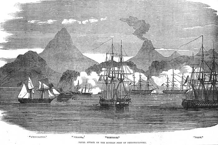 Нападение с моря на русский порт Петропавловск. Иллюстрация из газеты Лондонские новости" от 25 ноября 1854 г Фрагмент. Смотреть полностью.