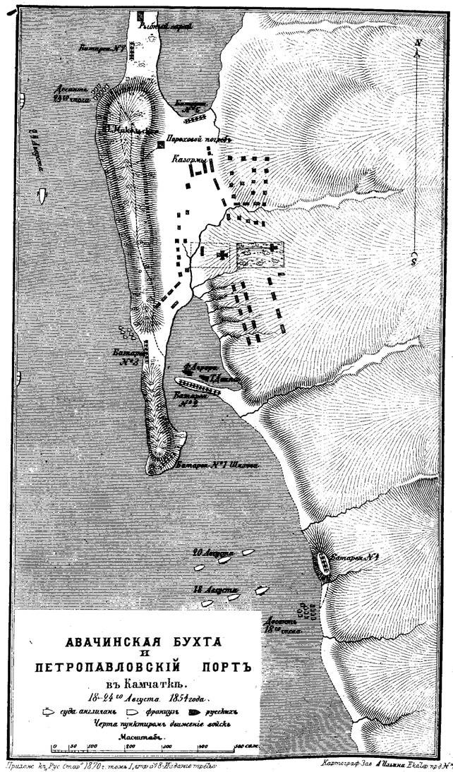 Авачинская бухта и Петропавловский порт 18-24 августа 1854 года. Гравированная карта из приложения к «Русской старине» 1870 г.