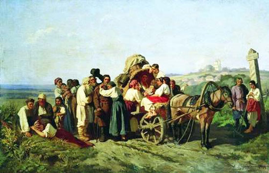 Переселенцы из Курской губернии. Художник: Трутовский Константин Александрович (1826-1893) 94 x 143 см Холст, масло. 1864 (?) Государственный Руссий музей Санкт-Петербург Фрагмент. Смотреть полностью.