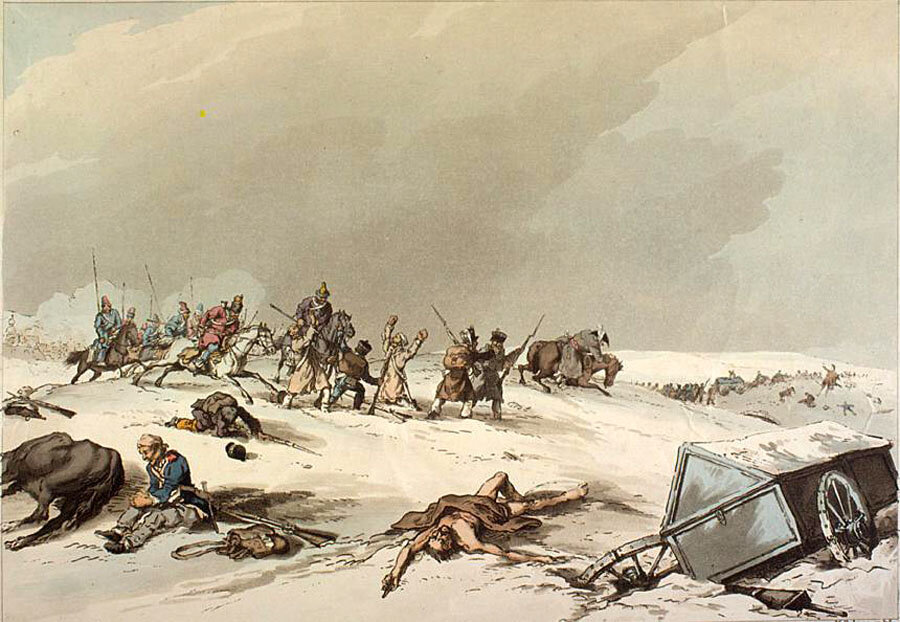 В Ошмянах надеялся Мюрат составить арьергард из дивизии Луазона , заключавшей в себя при выступлении из Вильны 10 000 человек. Из них в три дня погибло от мороза 7000; остальные с великим трудом держали ружья. Два находившихся с Луазоном Неаполитанских конных полка понесли еще большую убыль. Проходя парадом через Вильну, половина их замерзла, а по прошествии двух дней остальные умерли на дороге, или были привезены назад в Вильну, с отзнобленными ногами, руками и лицами. Лютая стужа, отъезд Наполеона и неотступные напоры авангарда Дунайской армии и летучих отрядов произвели между Французами такое смятение, что от Ошмян бежали они до Вильны без арьергарда. Пленных взято в Ошмянах до 2000. «Гораздо боле набирать бы их можно», доносил Чичагов Кутузову: «Все, которые только настигаются, падают во власть нашу, но отделяя для препровождения их команды, авангард мог бы себя ослабить, для того неприятели остаются бродящими и безоружными. Пушек взято 61 и множество зарядных ящиков, с прочим обозом в превосходнейшем гораздо числе против прежних дней. Пленный адъютант Маршала Даву, де Кастри, сказывал мне, что он имел поручение от Даву разведать о силе моей армии, их преследующей, и в ожидании своего арьергарда оставался в Ошмянах. Вместо того, с прибытием нашего авангарда, был он взят, не постигая даже до сих пор, куда их арьергард мог деваться». Князь Кутузов отвечал: « Одно быстрое преследование только может дать такую чувствительную поверхность над неприятелем, уже от 6-го Октября бегущим и утомленным. Не взирая на сие предлагаю вам продолжать ваше преследование». Чичагов усердно исполнял волю Фельдмаршала и не отставал от авангарда. Когда он 26-го подходил к Ошмянам, Князь Кутузов переехал из Радошкевичей в Молодечно, Граф Витгенштейн шел на Неставишки, Тормасов с главною армиею к Ракову, Милорадович был между Воложиным и Вишневым. 27-го Ноября, неприятели бежали чрез Медники к Вильне. Дорога становилась гористее; на всех возвышениях и пригорках стояли покинутые ящики, фуры, экипажи, пушки; от Ошмян до Медников насчитали 16, а от Медников до Вильны 31 брошенных орудий. Везде валялись умиравшие, замерзлые неприятели и обнаженные их трупы. Колеса нашей артиллерии можжили члены их и черепа, вдавливали и втаптывали кости их в снег. Во многих местах тела были навалены одно на другое в различных положениях, с теми искривленными лицами, какие были у людей, замерзавших в борьбе со смертью. Иной сидел, оскалив зубы, другой стоял с сжатым, грозящим кулаком, третий с распростертыми руками глядел, вытаращив глаза; кто лежал на спине, поднявши ноги , кто стоял на голове вверх ногами.