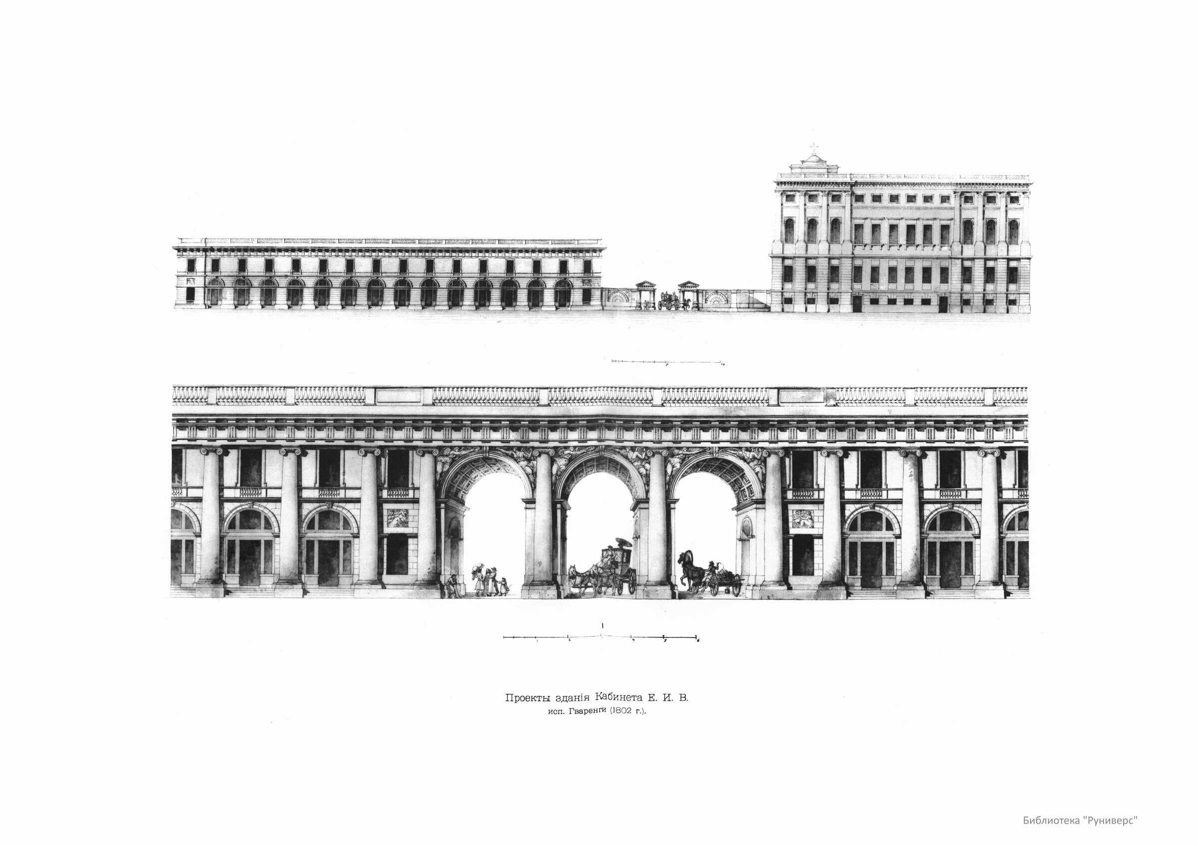 Из двух проектов [Кваренги]10 января 1803 года Император Александр I, как видно из письма действительного тайного советника Трощинского к управляющему Кабинетом, «изволил апробовать те планы и фасады, которые с колоннами, признавая их лучшими и более красоты зданию дать могущими». Очень интересно объяснение стиля здания, данное самим Гваренги в письме к знаменитому Канове, который считался авторитетом в вопросах античного искусства. Письмо характеризует зодчего, который с любовью и вниманием относился к своим произведениям, и показывает, как при основательном изучении великих образцов он умел сохранить свободу творчества. «Пользуюсь отправлением курьера в Неаполь, — пишет Гваренги, — чтобы послать вам рисунок здания, соприкасающегося с домом Кабинета Его Величества. Эту постройку я недавно окончил. Она должна служить частью для квартир служащих в Кабинете, частью для лавок торговцев предметами роскоши. Так как постройка расположена в одном из наиболее оживленных кварталов города, то я счел подходящим устроить аркады для утренних прогулок. Украшения самого дома исполнены в коринфском стиле, но я нашел, что ионический ордер лучше подойдет к моей постройке, так как он как бы подчинен первому, и чтобы достигнуть большей характерности и рельефности, я употребил дорический антаблемент. Это кажущееся новшество немного смутило наших законодателей искусства. Но за исключением тех, которые интересуются моими произведениями, критика по этому поводу меня мало смущает. Лучше бы сделали, если бы указали мне ошибки в тех или иных частностях. Уверен, что во многом можно меня упрекнуть, и я с благодарностью воспользовался бы соответствующими указаниями. Слишком хорошо сознаю границы моего дарования, чтобы решиться считать это здание безукоризненным, и считаю несомненным, что ничто не способствует совершенствованию человеческих знаний так, как вдумчивая и обоснованная критика без ненависти и зависти. Из того, что я скажу вам, опираясь на соответственные примеры, вы увидите, что употребление непременно определенного антаблемента для увенчания (колонн) данного ордера не является непреложным архитектурным догматом. Саркофаг Сципиона Барбата, открытый несколько лет тому назад в Риме,— самый древний из известных мне примеров в этом роде: на нем дорический карниз украшен ионическим орнаментом. Нимфеум на озере Альбано и могила у стены Агригента в Сицилии, известная под названием могилы Теона, украшены ионическими колоннами и дорическим антаблементом. Первый этаж Колизея исполнен в дорическом стиле, но антаблемент над ним не таков. Колонны арки Августа, находящейся вблизи цитадели города Аосты в Пьемонте,— коринфские, а антаблемент над ними— дорический, в соответствии с тем, что говорит Витрувий в первой главе четвертой книги своего трактата об архитектуре, когда описывает коринфский ордер и его пропорции: Caetera membra, quae supra columnas imponuntur, aut e doricis symmetriis aut ionicis moribus in corinthiis columnis collocantur etc. Очень много подобных образцов можно найти на античных барельефах. Я зарисовал два во время своих путешествий: один в Венеции, в передней дворца Нани около церкви Сан-Тровазо, а другой в Вероне, во дворе филармонической академии. Наконец, вы можете найти указания у нашего знаменитого архитектора Теманца в том месте, где он говорит о мосте Августа в Римини. Мног