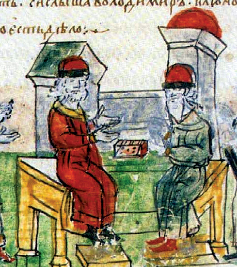 Беседа Владимира Святославича с греческим философом о христианстве. Миниатюра из Радзивилловской летописи, л. 49 об. XV в. Библиотека Академии наук Санкт-Петербург Фрагмент. Смотреть полностью.