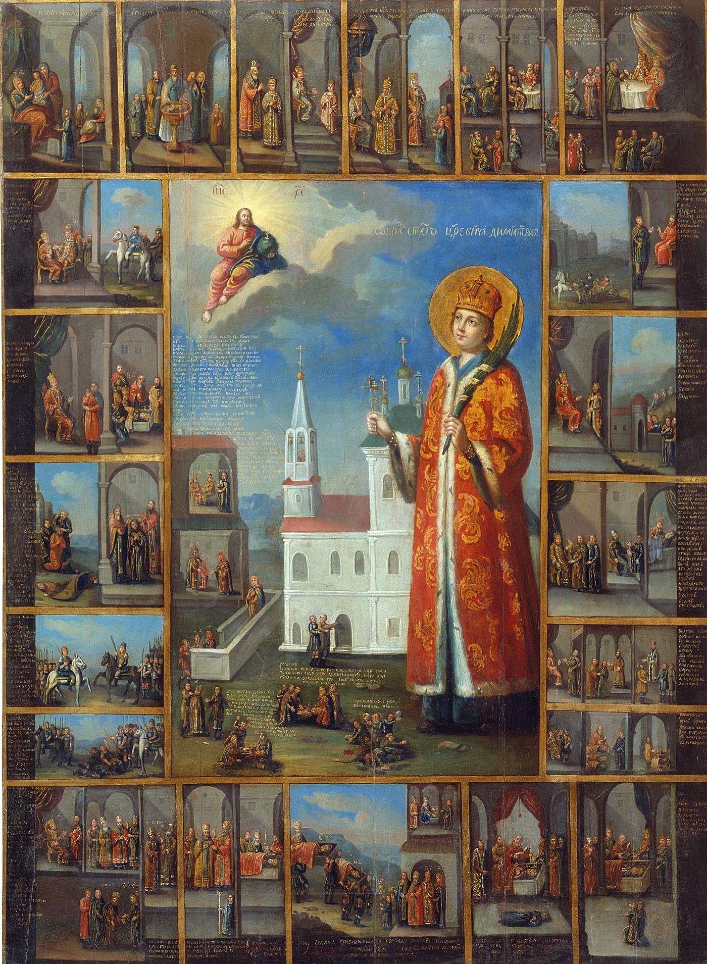 Икона «Святой царевич Димитрий в житии» в 21 клейме XVIII в. Темпера, левкас 137х101 см Государственный музей истории религии Санкт-Петербург Фрагмент. Смотреть полностью.