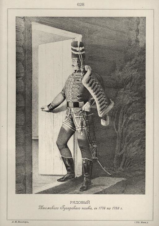 Рядовой Изюмского гусарского полка. Иллюстрация из книги «Историческое описания одежды и вооружения российских войск» под ред. А.В. Висковатова. СПб., 1841–1862 г.г. Фрагмент. Смотреть полностью.