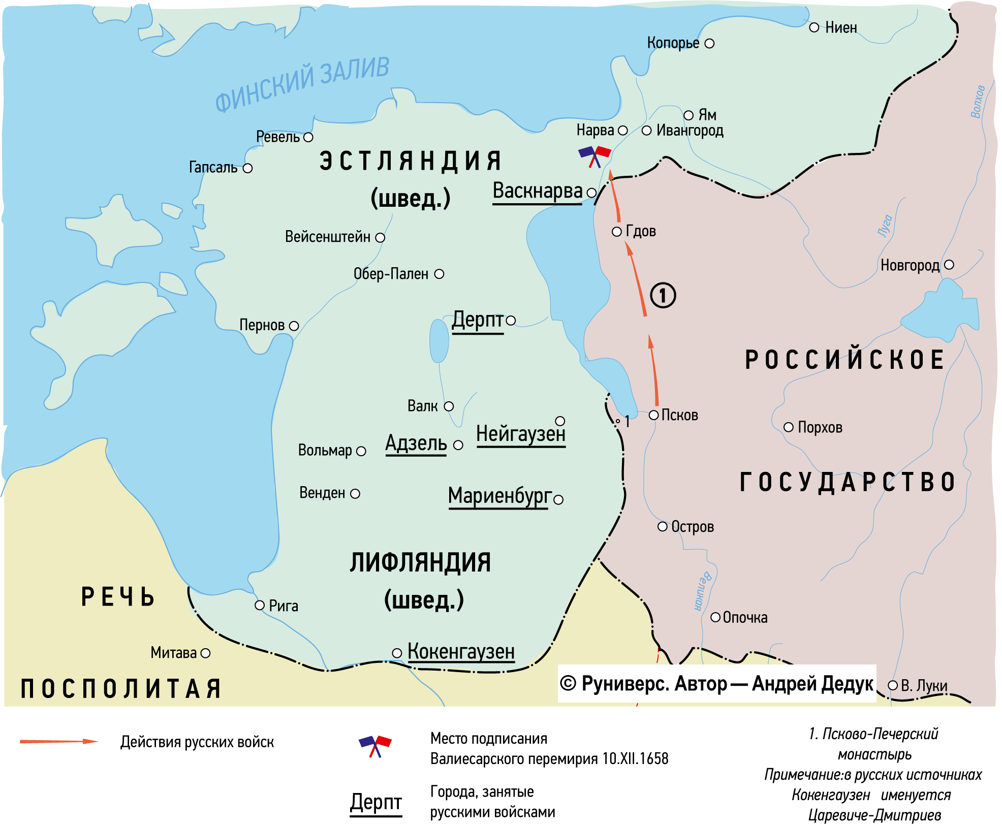 Итак, война со Швецией была закономерным этапом русско-польского конфликта и борьбы за гегемонию в Восточной Европе в целом. Предлагаемая вашему вниманию монография – первый опыт обобщенного военно-стратегического обзора боевых действий войны 1656 – 1658 гг. в тесной связи с развитием дипломатических отношений и изменениями международной обстановки в Восточной Европе.