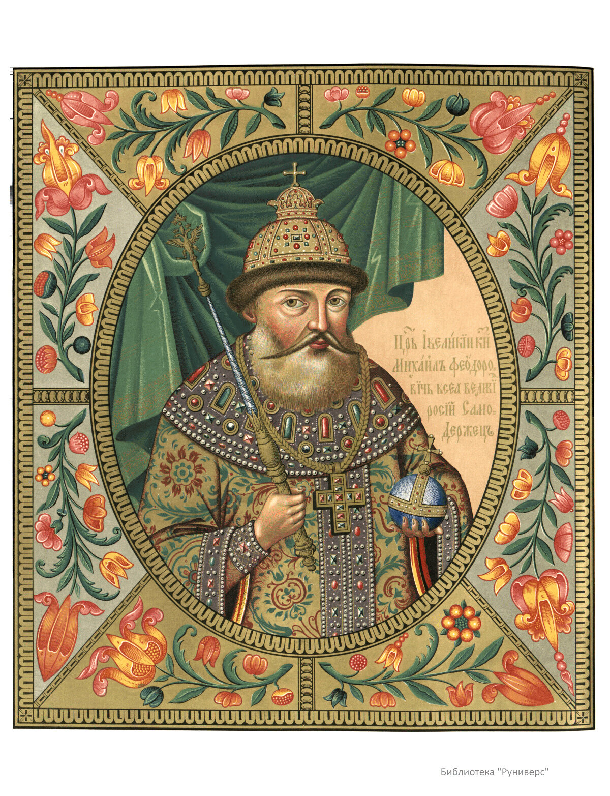 По совершении миропомазания, митрополит обратился к Государю с словами: «приступи, Царю, аще достоин еси, помазанный, причаститися». Государь был причащен Святых Таин, и, приняв снова знаки царского достоинства, возвратился на прежнее место. К антидору Царь опять подходил сам; при этом подавался ему и «укроп с вином». Совершив отпуск литургии, митрополит вышел из алтаря и постланным царским путем приблизился к Государю; по обе стороны шло все остальное, сопровождавшее его, высшее духовенство. Поздравляя Царя с миропомазанием и святым причащением, подали ему просфору. Государь пригласил все духовенство к своему царскому столу. В заключение литургии, митрополит благословил Царя крестом; Царь же приложился ко кресту. Сопровождаемый боярами и прочими представителями светской власти, Государь, во всех знаках царского сана, в венце и бармах, с цепью на шее, со скипетром и державою в руках, вышел из южных дверей Успенского собора на рундук, в направлении к Архангельскому собору. При самом выходе, на рундуке, Федор Иванович Мстиславский, в качестве главного боярина, трижды осыпал его с головы золотыми и серебряными деньгами из мисы, которую держал Траханиотов. Путь по рундуку устлан был красным сукном. Государь прошел по нем к северным дверям Архангельского собора, вступил во внутренность храма, встречен ектениею, благословлен от местного протопопа крестом и обошел святые мощи и гробы древних Государей, прикладываясь, но не снимая венца. Когда же из Архангельского собора Царь вышел на площадь и вступил на рундук, снова трижды осыпали его золотыми и серебряными деньгами, подобно тому, как в первый раз. От Архангельского собора, из западных дверей его, Государь по рундуку, пошел в Благовещенский собор и вступил в него северными дверями: здесь также встретили его ектениею, а протопоп благословил крестом, к которому Царь также приложился. Михаил Федорович вышел из западных дверей собора, и, как только сошел с паперти и вступил на рундук, точно также совершено в третий раз троекратное осыпанье деньгами. Из Благовещенского собора, по рундуку, Государь подошел к так называемой середней лестнице, находившейся в средине пространства между помянутым собором и Грановитой палатой. Она вела также золотую палату, но прямо с площади, и заменяла Благовещенский ход, почему, между прочим, служила для послов нехристианских вероисповеданий. В виду всего народа, стоявшего на площади, Государь поднялся середнею лестницею в свои чертоги. Впрочем, некоторые памятники утверждают, что Михаил Федорович взошел золотою лестницею, возле Грановитой палаты. Между тем в Успенском соборе духовенство разоблачилось на чертожном месте и вышло из церкви. Престол, седалища и скамьи, постланные бархаты и камки для путей и мест, где стояли Государь и высшие сановники, заблаговременно сняты. Все остальное, то есть сукна и украшения чертожного места, разобраны были народом, на память царского венчания. В тот же день у Государя был большой стол и пир, в Грановитой палате. Царь сидел за особым столом; при нем, для служения, находился постельничий Константин Иванович Михалков; за кушаньем царским смотрел стольник Борис Михайлович Салтыков. Высшее духовенство сидело за обедом «в кривом», ближайшем к Государю, боковом столе, находившемся под смотрением стольника Василья Матвее