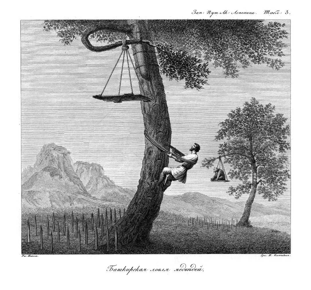 Полное собрание ученых путешествий по России, издаваемое Императорскою Академией Наук, по предложению ее президента. Том третий. Записки Путешествия Академика Лепехина. Спб., 1821 Дневные записки путешествия доктора и Академии наук адъюнкта Ивана Лепехина по разным провинциям Российского государства. Полное собрание ученых путешествий. Том 3. 1821 год. Глава VIII. Возвратный путь к Волге по Соку ...8 числа г. Статский Советник [ Иван Петрович Рычков ] приготовил нам любопытное зрелище. Призвав одного Башкирца, приказал eмy показать способ как они лазят в свои борти и сохраняют соты oт лакомых до меду медведей: ибо Башкирцы, живучи в лесистых местах, делают свои ульи на высоких соснах, и только временной имеют присмотр, тo есть с весны и с осени. Лазят они на дерево, имея из тонких ремней сплетенной шириною в три пальца и нарочито упругой канат, кирям. В дереве делают небольшие зарубки, киртык, так чтобы ножные пальцы могли в оныя вместиться. Когда хотят лезть на дерево тогда оное обняв кирямом скрепляют концы в петлю, и положит его чрез левое плечо и поясницу, упираются ногами в дерево и вешаются на канат навзничь. Потому руками взбрасывая канат к верху и лежа на оном, удобно могут лезть к верху и в низ спускаться. Для предостерегания меду от медведей нарочито смешные выдуманы способы. Над закрышкою улья прикрепляют веревку, на которую навешивают чурбан талык, так чтобы он висел по самому тому месту, где медведю к улью лезть надобно. Чурбаны препятствуя в предприятии медведю, досаждает ему; почему он, стараяся его отвесть с дороги, толкает в стopoнy. Чурбан приведенный в движение, бьет медведя или в бок, или в голову; от чего медведь разсердясь, сильнее бьет лапою в чурбан и далее его отталкивая сильнейший получает удар. Cиe позорище продолжает он до теx пор, пока или выбившись из силы, или от сильнаго чурбаннато удара низвергается. Другой способ сocтоит в следующем. На сук дерева, кoтopого вершину можно довесть до отверстия улья, привязывают на веревках четвероугольную зыбку (люльку), и приведши с нею сук к затворке улья, прикрепляют оной тоненькою веревкою. Медведь лезя на дерево, неотменно принужден бывает садиться на люльку, чтобы добраться до улья: но как в сем случае веревочка, которою сук прикреплен с люлькою, совершить его намерение препятствуeт, тo он перерывает оную. Сук, освобожденный oт притягающей силы, сродною себе упругостию разпространяется, и люльку с медведем от дерева относит. И так медведь принужден бывает на ней качатся до тех пор, пока хозяин улья не придет и не убьет его: ибо взобраться на дерево разстояние, а на землю скочить отчасти высота и отчасти острые вколоченные около дерева колья воспрещают. Лепехин Иван Иванович (1740—1802 гг.), известный путешественник и ботаник. Изучал также медицину в Страсбурге. Лепехин вел переписку с Ломоносовым, который предназначал его к занятию кафедры ботаники в Академии. Получив в 1767 г. степень д-ра медицины, Лепехин вернулся в Петербург и был определен адъюнктом, а с 1771 г. академиком по естественным наукам. В 1768-72 гг. Лепехин предпринял,— частью один, частью с Палласом, — путешествие с научной целью по ЮВ и отчасти северу Европейской России, причем составил замечательные для своего времени ботанические коллекции. В 1773-74 гг. Л. путешествовал по Белоруссии. По возвращении был назначен директором ботанич