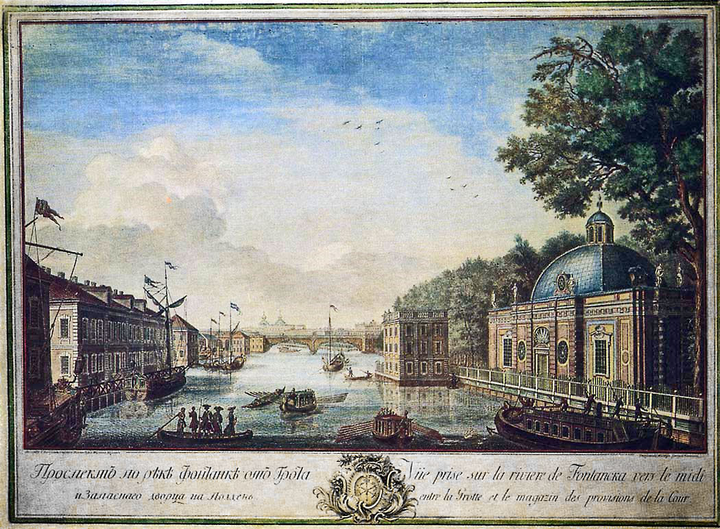 Река Фонтанка у Грота и Запасного дворца. Петербург. Художник: Качалов Григорий Аникиевич (1711 - 1759) с рисунка Махаева Михаила Ивановича (1718-1770), сделанного в 1748 г. 49 х68 см Офорт, гравюра резцом, акварель, гуашь 1753 год Государственный Эрмитаж (РГ-20013) Санкт-Петербург Фрагмент. Смотреть полностью.