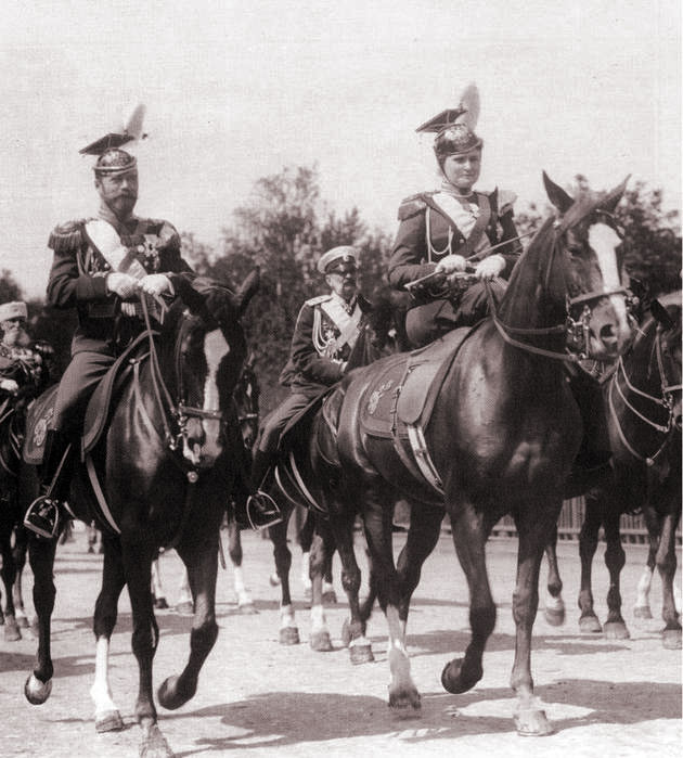 Фотография Николая II и Императрицы Александры Федоровны в дни празднования 100-летия лейб-гвардии Уланского Её Величества Государыни Императрицы Александры Фёдоровны полка. Петергоф. 15 мая 1903. Фрагмент. Смотреть полностью.