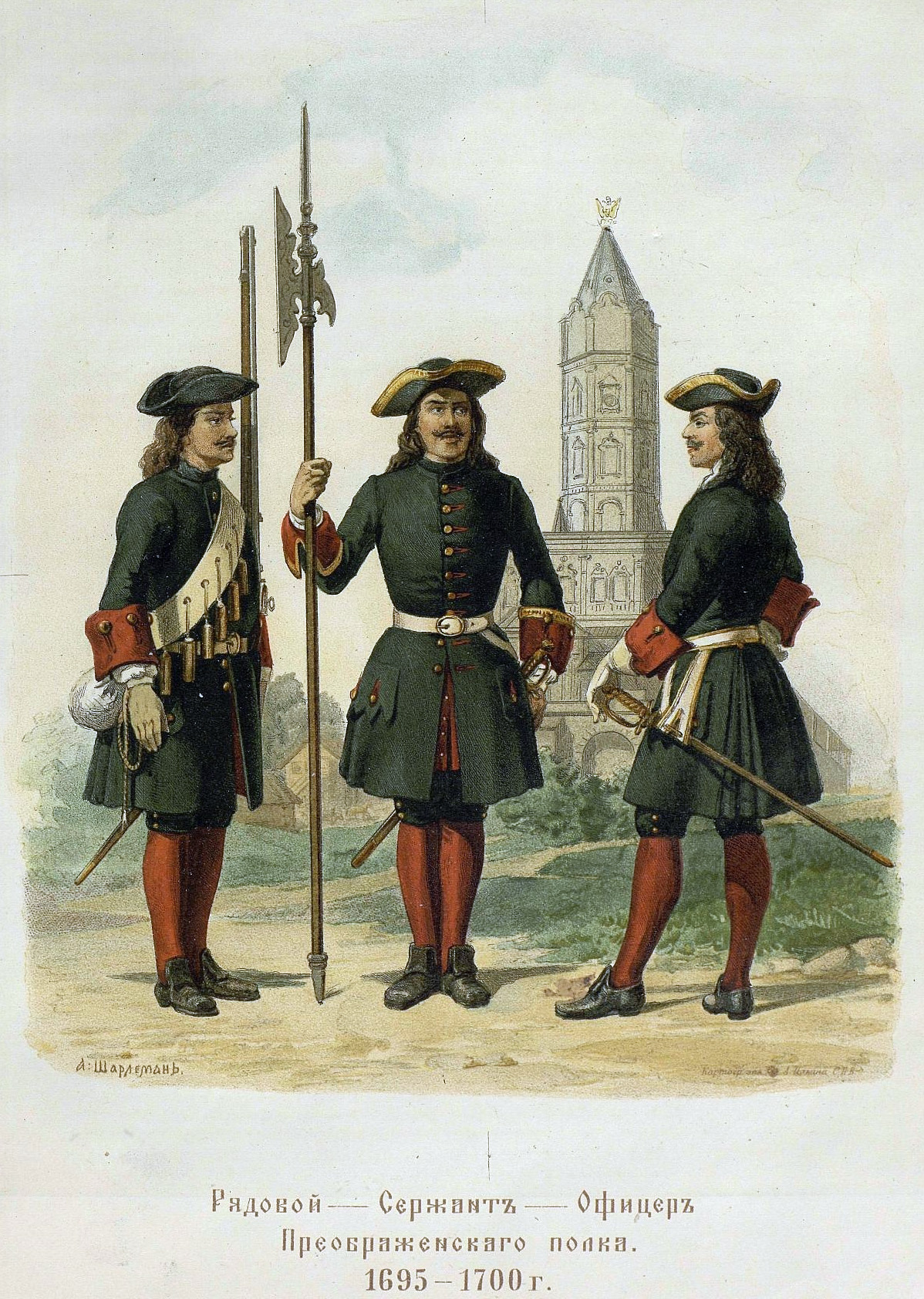 Униформа рядового, сержанта и офицера Лейб-гвардии Преображенского полка в 1695-1700 годах Художник: Шарлемань Адольф Иосифович (1826-1901) Литография с оригинального рисунка Иллюстрация в издании: Бобровский П. О. История лейб-гвардии Преображенского полка: 1683–1900: в 2 т. и 2 прил. — СПб., 1900–1904 Фрагмент. Смотреть полностью.