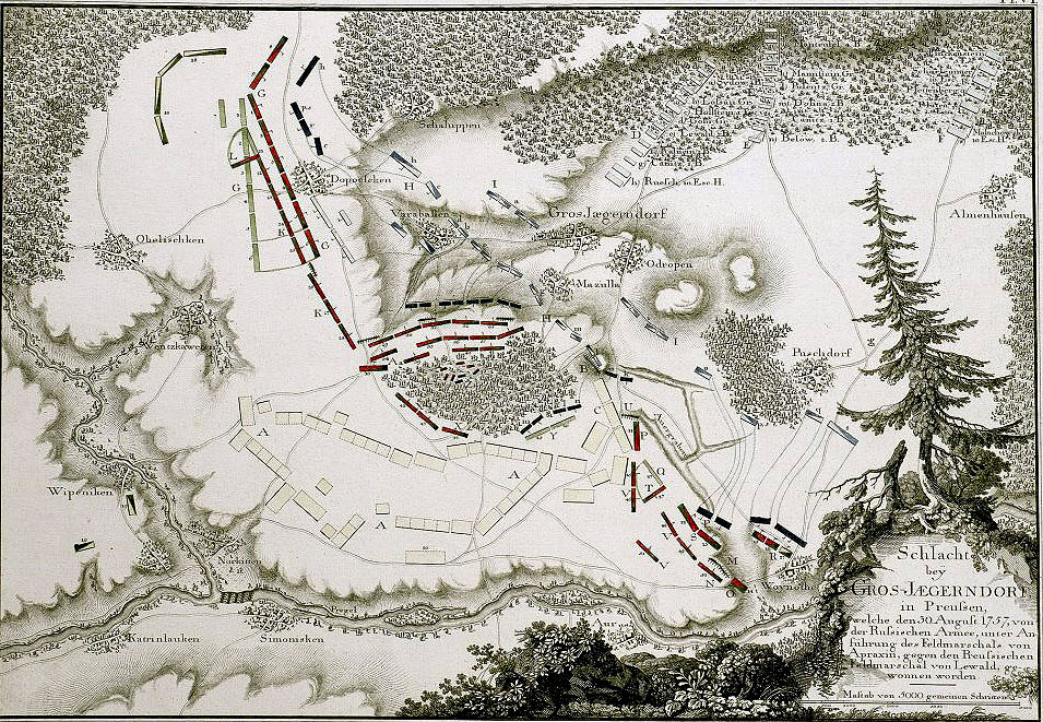 Реляция С.Ф. Апраксина императрице Елизавете Петровне о сражении при Гросс-Егерсдорфе 20 августа 1757 Гросс-Егерсдорф Божиею споспешествовавшею милостию, управлением всемогущия его десницы и щастием вашего императорского величества вчера совершенная и главная над гордым неприятелем одержана победа. В пятом часу пополуночи, когда победоносное вашего величества оружие из лагеря под местечком Наркитином в поход выступать начинало и чрез лес дефилировать имело, и то самое время перебравшейся на сию же сторону 17 числа и в лесу не далее мили от вверенной мне армии лагерем в таком намерении ставшей неприятель, чтоб нашему дальнему чрез лес проходу мешать, чего ради и три дни сряду разными своими движении нас атаковать вид показывал, всею силою под предводительством генерал-фельдмаршала Левальда из лесу выступать, сильную пушечную пальбу производить и против нас в наилучшем порядке маршировать начал. По прошествии получаса, приближась к нашему фронту, с такою фуриею сперва на левое крыло, а потом и на правое напал, что описать нельзя; огонь из мелкого ружья безперерывно с обоих сторон около трех часов продолжался. Я признаться должен, что во все то время, невзирая на мужество и храбрость как генералитета, штаб и обер-офицеров, так и всех солдат, и на великое действо новоизобретенных генералом-фельтцейхмейстером графом Шуваловым секретных гаубиц, которые толикую пользу приносят, что, конечно, за такой его труд он вашего императорского величества высочайшую милость и награждения заслуживаем. О победе ничего решительного предвидеть нельзя было, тем паче, что вашего императорского величества славное войско, находясь в марше за множеством обозов, не с такою способностию построено и употреблено быть могло, как того желалось и поставлено было, но справедливость дела, наипаче же усердные вашего императорского величества к всевышнему молитвы поспешив, гордого неприятеля победоносному вашему оружию в руки предал. Итако, всемилостивейшая государыня, оной совершенно разбит, разсеян и легкими войсками чрез реку Прегелю прогнан до прежнего его под Велавом лагеря. Я дерзаю с сею богом дарованною победоносному оружию нашему милостию ваше императорское величество со всеглубочайшим к стопам повержением всеподданнейше поздравить, всеусердно желая, да всемогущий благоволит и впредь оружие ваше в целости сохранить и равными победами благословить для приращения неувядаемой славы вашего величества и устрашения всех зломыслящих врагов. В сей между местечком Наркитином, деревнями Гросс-Егерсдорфом и Амельсгофом жестокой акции, какова по признанию чужестранных волентиров, особливо же римско-императорского генерала-фельдмаршала-лейтенанта барона Сент-Андре еще в Европе не бывало, как ваше императорское величество из приложенной при сем копии с реляции его всемилостивейше усмотреть изволите. С нашей стороны бывшей урон за краткостию времяни еще не известен; но между убитыми щитается командующей левым крылом генерал Василей Лопухин, которой так мужественно и храбро, как я сам пред тем с четверть часа его видел с ним говорил, поступал и солдат ободрял, что я без слез об нем упомянуть не могу, ибо потерял такого храброго генерала, которой мне впредь великую помощь, а вашему императорскому величеству знатную службу оказать мог. Генерал-порут