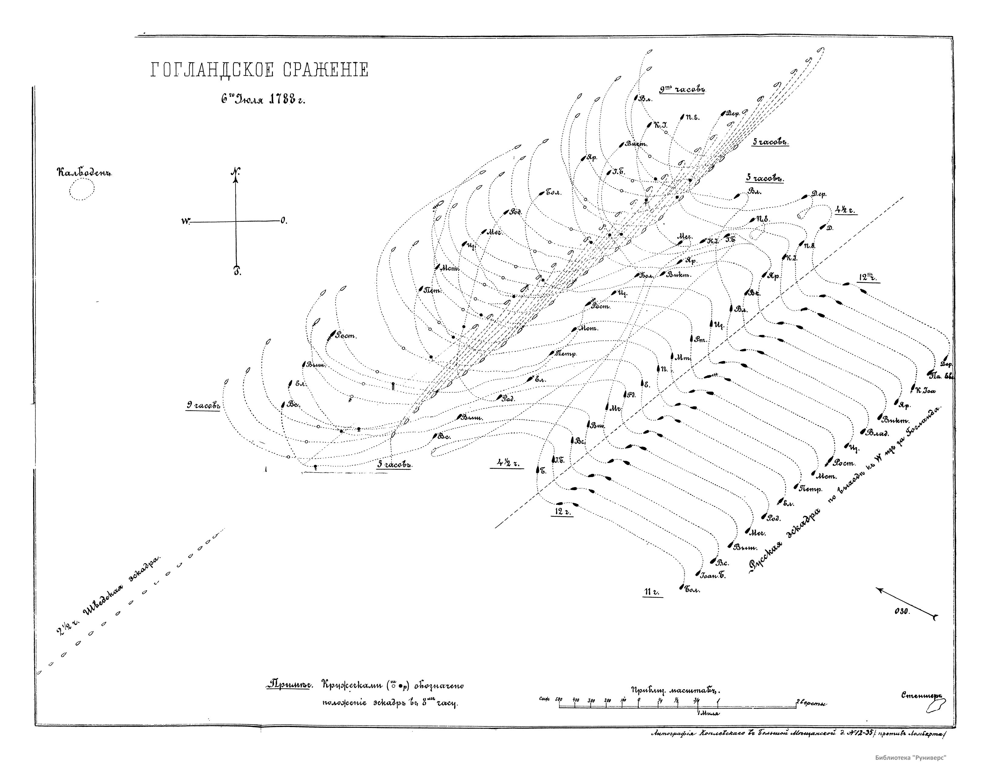 Два наши передние корабля выбыли из линии: затем оставшиеся между «Всеславом» и «Ростиславом» быстрее прочих выдвинулись вперед и сблизились с неприятелем; а между тем авангардия Фондезина растянулась и не подошла до надлежащей дистанции для полного действия своих выстрелов — пальбу же начала она вместе с прочими, и потому с самого начала сражения, при беглом огне с обеих сторон, эскадры заволокло густым дымом. Все это вместе было причиной, что в первый момент боя линия наша была в порядочном расстройстве — как это видно на приложенном плане; тогда как шведские корабли сохранили полный строй, как на маневрах: Всеслав, Вышеслав, Родислав, Елена, Петр, Мстислав и Ростислав завязали дело вплоть с 12-ю шведскими судами, из которых было только два фрегата. Ростислав вышел вперед из линии и бил учащенными выстрелами по шведскому генерал-адмиральскому кораблю. В него направлены были выстрелы следующего неприятельского корабля. Изяслав, поддерживая своего адмирала, завязал дело с 13-м в линии шведским кораблем и следующим за ним фрегатом. За ним Болеслав, Мечеслав и Владислав, вышедшие из линии находились в огне у 9-ти неприятельских кораблей, которых только издали развлекала наша ариергардия. Это был первый фазис сражения. Команды наших кораблей действовали с энергией и даже с излишней запальчивостью, посылая в орудия по два и более снаряда, вследствие чего разорвало несколько орудий, и у одного, на Владиславе, перебило всю прислугу. Скоро за тем корабли Мстислав и Петр, сближаясь с неприятелем, начали отставать; Ростислав, стараясь удержаться на месте, положил грот-марсель на стеньгу и когда увидел, что это его не могло удержать от близкого столкновения с кораблем Петр — привел, обошел с наветренной стороны два корабля и вступил в кильватер кораблю Елена, где обратил свои орудия на других противников. В ½7-го шведские корабли начали приходить в замешательство — спустились несколько, и сомкнули линию, стараясь заслонить сильно избитый свой генерал-адмиральский корабль. Эскадра наша за ними последовала и, побуждаемая приказаниями Грейга, который на шлюпках разослал новый ордер кораблям, исправивши насколько возможно было линию, неутомимо продолжала поражать неприятельские корабли — при чем арьергардия не переставала сохранять дальнюю дистанцию, оставляя корабль Владислав в жертву сосредоточенным выстрелам шведской арьергардии, без всякой поддержки и надежды выбраться на ветер; выстрелы с корабля Дерись вовсе не долетали до неприятеля. Настало маловерие и сражающихся вновь заволокло непроницаемым дымом. Звуки командных слов слышались как вопли, свистки умолкли и в ушах сражавшихся раздавался только учащенный гул орудий и стоны раненых. Это был второй момент сражения. В 9 часов шведский флот во второй раз спустился. Он заслонил и вывел за линию все свои корабли наиболее пострадавшие от нашей авангардии, а для прикрытия разбитых левых бортов своих прочих кораблей, поворачивая постепенно через фордевинд, привел на правый галс. Ветер совсем затих; большая часть сражавшихся поворачивала при помощи буксира. Ростислав преследовал вплоть шведский вице-адмиральский корабль; Всеслав, Елена и Вышеслав нагоняя неприятеля имели уже по одному противнику. Дерись, Память Евстафия и И. Богослов остались за линией; прочие корабли нашей эск