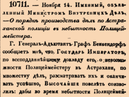 10711. 1837 год. 26 ноября (14 ноября ст.ст.) Именный, объявленный Министром Внутренних Дел. О порядке производства дел по Астраханской полиции в небытность Полицмейстера. Г. Генерал-Адъютант Граф Бенкендорф сообщает мне, что Государь Император, по всеподданнейшему докладу его, о невозможности Полицмейстеру в Астрахани, по множеству дел, разсматривать их и оканчивать успешно, Высочайше повелеть соизволил: дабы во время небытности Полицмейстера в присутствии полиции, по исполнению других его обязанностей, по распорядительной части в городе, дела в полиции были оканчиваемы под председательством старшаго из членов
