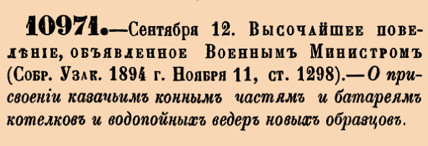 10971. 1894 год. 24 сентября (12 сентября ст.ст.) Высочайшее повеление, объявленное Военным Министром. О присвоении казачьим конным частям и батареям котелков и водопойных ведер новых образцов. <…> Конным полкам, дивизионным, сотням и конным батареям всех казачьих войск, первоочердным и льготным, присвоить на будущее время водопойные ведра образца 1885 года и медные одиночные котелки образца 1882 года, последние за исключением ездовых казачьих батарей, коим иметь тройные котелки образца 1871 года.