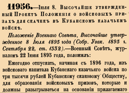 Ежегодно отпускать, начиная с 1896 года, из войсковаго капитала Кубанскаго казачьяго войска по три тысячи рублей Кубанскому скаковому Обществу, для образования войсковых призов, которые и должны разыгрываться на основании прилагаемаго Положения <…>