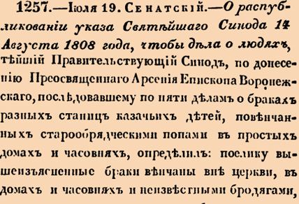 1257. 1827 год. 31 июля (19 июля ст.ст.) Сенатский. О распубликовании указа Святейшаго Синода 14 Августа 1808 года, чтобы дела о людях, вступившихв брак по раскольническому обрыду, разсматривать и судить Гражданским, а не Духовным Правительством.<…> не могут они признаны быть за браки законные, а за сопряжения любодейные