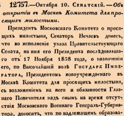 Президентъ Московскаго Комитета о просящихъ милостыни, Сенаторъ Нечаевъ донесъ, что во исполненіе указа Правительствующаго Сената, на имя его Президента послѣдовавшаго отъ 17 Ноября 1858 года, о назначенiи его, по Высочайшей волѣ ГОСУДАРЯ ИМПЕРАТОРА, Президентомъ новоучреждаемаго въ Москвѣ Комитета для просящихъ милостыни, съ возложеніемъ на него и обязанности Главнаго Попечителя надъ онымъ на время отсутствія Московскаго Военнаго Генералъ-Губернатора, доноситъ, что по надлежащемъ образованіи сего Комитета на основаніи ВЫСОЧАЙШЕ утвержденнаго объ ономъ положенія 5 Сентября 1858 года (11514), открылъ оный свои дѣйствія 6 числа минувшаго Августа. О чемъ онъ, Президентъ Комитета, доноситъ Правительствующему Сенату, испрашивая распоряженія: не благоугодно ли будетъ объявить о таковомъ открытіи Комитета повсемѣстно указами. Правительствующій Сенатъ опредѣлилъ: о томъ, что ВЫСОЧАЙШЕ учрежденный въ Москвѣ Комитетъ для просящихъ милостыни, открылъ свои дѣйствія, припечатать въ Сенатскихъ вѣдомостяхъ.