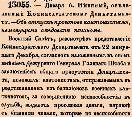 13055. 1840 год. 18 января (6 января ст.ст.) Именный, объявленный Коммисариатскому Департаменту. Об отпуске прогонов кантонистам, немогущим следовать пешком. Военный Совет, разсмотрев представление Коммисариатскаго Департамента от 22 минувшаго Декабря, согласно изложенным в оном мнением Дежурнаго Генерала Главнаго Штаба и заключением общаго присутствия Депаратмента, положил: кантонистам, отправляемым к родственникам из баталионов военных кантонистов, за совершенною неспособностию к службе, выдавать прогонныя деньги <…>