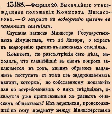 13188. 1840 год. 4 марта (20 февраля ст.ст.) Высочайше утвержденное положение Комитета Министров. О мерах к водворению цыган в казенных селениях. Комитет, по разсмотрении сего дела, находил, что главнейший в оном вопросе заключается в том, каким образом надлежит поступать с теми из задерживаемых цыган, которые, пол собственному показанию или по истребованным о них сведениям, окажутся уже приписанными к разным сельским обществам? <…>ородскую Полицию, утвердил Я штат оной, от вас представленный, присоединив к тому и нужную воинскую команду на казенном иждивении <…>