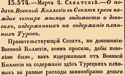 Правительствующий Сенат, по долношению Военной Коллегии, коим просила, дабы повелено было, как издержанныя от Военной Коллегии на содержание здесь Турецких пленных на разные расходы заимообразно деньги 3790 рублей 69 копеек, возвратить в Военную Коллегию, так и впредь на содержание их повелеть Штатс-Конторе, по требованию Военной Коллегии, отпускать из штатских доходов. Приказали: как на таковыя издержки суммы Военная Коллегия не имеет, то об отпуске по представлению оной Коллегии доныне издержанных и о ассигновании впредь по случаю, что Государственные доходы состоят в ведомстве 1-го Сената Департамента, сообщить в оный Lепартамент <…>