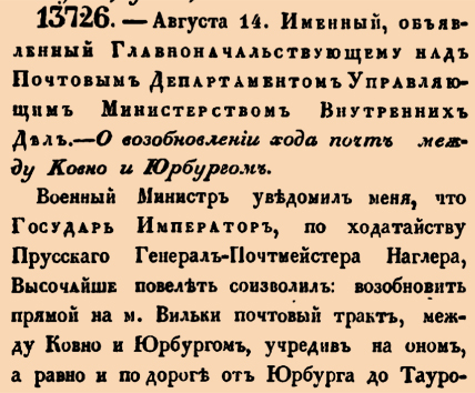 13726. 1840 год. 26 августа (14 августа ст.ст.) Именный, объявленный Главнокомандующему над Почтовым Департаментом Управляющим Министерством Внутренних Дел. О возобновлении хода почт между Ковно и Юрбургом. Военный Министр уведомил меня, что Государь Император, по ходатайству Прусскаго Генерал-Почтмейстера Наглера, Высочайше повелеть соизволил: возобновить прямой на м.Вильки почтовый тракт, между Ковно и Юрбургом, учредив на оном, а равно и по дороге от Юрбурга до Таурогена троекратный в неделю прямый ход почт, с тем, чтоб оный был в связи с проходящим чрез Тауроген С.Петербургскими легкими почтами