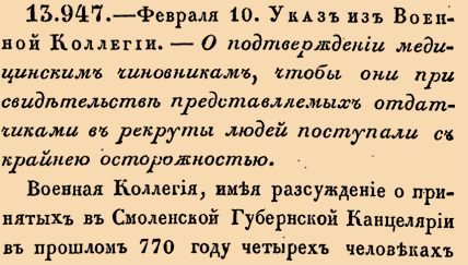 13947. 1773 год. 21 февраля (10 февраля ст.ст.) Указ из Военной Коллегии. О подтверждении медицинским чиновникам, чтобы они при свидетельстве представляемых отдатчиками в рекруты людей поступали с крайнею осторожностью. Военная Коллегия, имея разсуждение о принятых в Смоленской Губернской Канцелярии в прошлом 7770 году четырех человеках рекрутах, кои при командах от свидетельства Московской Медицинской Конторы оказались к службе неспособными<...>
