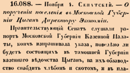 16088. 1784 год. 15 ноября (4 ноября ст.ст.) Сенатский. О поручении поселения в Московской Губернии Цыган Директору Экономии.Правительствующий Сенат слушали рапорт Московской Губернии Казенной Палаты, коим изпрашивала указа, повелено ли будет состоящих в тамошней Губернии казеннаго ведомства Цыган, на их обзаводство снабдить хлебом и скотом