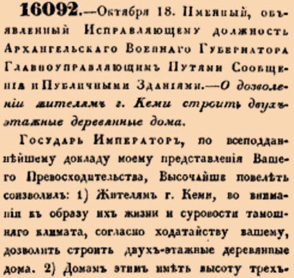 16092.— Октября 18. Именный, объявленный Исправляющему должность Архангельскаго Военнаго Губернатора Главноуправляющмъ Путями Сообщенія и Публичными Зданіями.—О дозволеніи жителямъ г. Кеми строить двухъ-этажные деревянные дома.