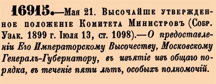 16915. 1899 год. 21 мая (2 июня). Высочайше утвержденное положение Комитета Министров. О предоставлении Его Императорскому Высочеству, Московскому Генерал-Губернатору, в изъятие из общаго порядка, в течение пяти лет, особых полномочий.