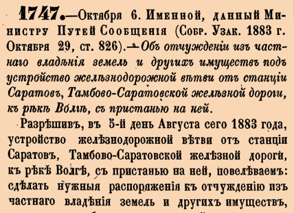 1747. 1883 год. 18 октября (6 октября ст.ст.) Именной, данный Министру Путей Сообщения. Об отчуждении из частнаго владения земель и других имуществ под устройство железнодорожной ветви от станции Саратов, Тамбово-Саратовской железной дороги, к реке Волге, с пристанью на ней.Разрешив, в 5-й день Августа сего 1883 года, устройство железнодорожной ветви от станции Саратов, Тамбово-Саратовской железной дороги, к реке Волге, с пристанью на ней, повелеваем: сделать нужныя распоряжения к отчуждению из частнаго владения земель и других имуществ <…>