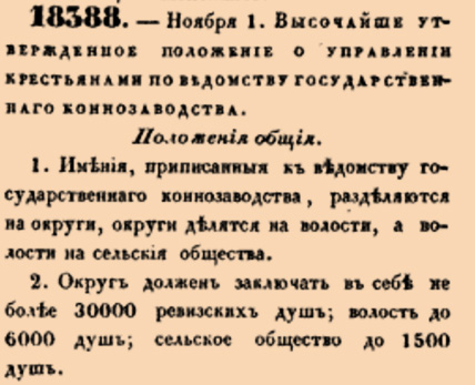 18388. 1844 год. 13 ноября (1 ноября ст.ст.) Высочайше утвержденное положение о управлении крестьянами по ведомству государственнаго коннозаводства. Положения общия.1. Имения, приписанныя к ведомству государственнаго коннозаводства, разделяются на округи, округи делятся на волости, а волости на сельския общества 2. Округ должен заключать в себе не более 30000 ревизских душ; волость до 6000 душ; сельское общество до 1500 душ <…>