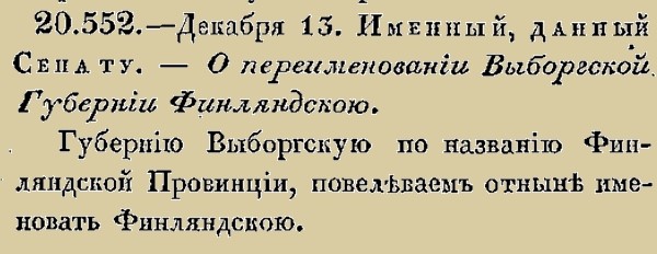 20.552.- Декабря 13. Именный, данный Сенату.- О переименованіи Выборгской Губерніи Финляндскою.