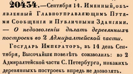 Государь Император, в 14 день Сентября, Высочайше повелеть соизволил: во 2 Адмиралтейской части Санкт-Петербурга никаких деревянных построек впредь не дозволять