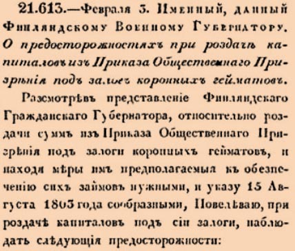 21613. 1805 год. 3 февраля (15 февраля). Именный, данный Финляндскому Военному Губернатору. О предосторожностях при роздаче капиталов из Приказа Общественнаго Призрения под залог коронных гейматов.
