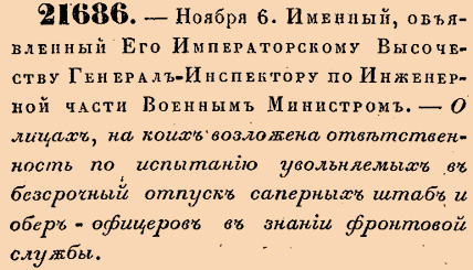 21686. 1847 год. 18 ноября (6 ноября ст.ст.) Именный, объявленный Его Императорскому Высочеству Генерал-Инспектору по Инженерной части Военным Министром.О лицах, на коих возложена ответственность по испытанию увольняемых в безсрочный отпуск саперных штаб и обер-офицеров в знании фронтовой службы.