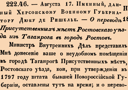 22246. 1806 год. 29 августа (17 августа ст.ст.) Именный, данный Херсонскому Военному Губернатору Дюку де Ришелье. О переводе Присутственных мест Ростовскаго уезда из Таганрога в город Ростов. Министр Внутренних Дел представил Мне донесение ваше о неудобном помещении в городе Таганроге Присутственных мест, Ростовскаго уезда, кои, при утверждении в 1797 году штата бывшей Новороссийской Губернии, оставлены тут на время; и о переводе оных вместе с штатною командою и уездным Казначейством в город Ростов <…>
