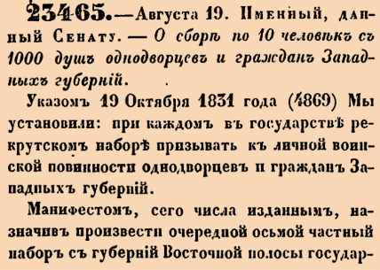 Указом 19 Октября 1831 года Мы установили: при каждом в государстве рекрутском наборе призывать к личной воинской повинности однодворцев и граждан Западных губерний <…>