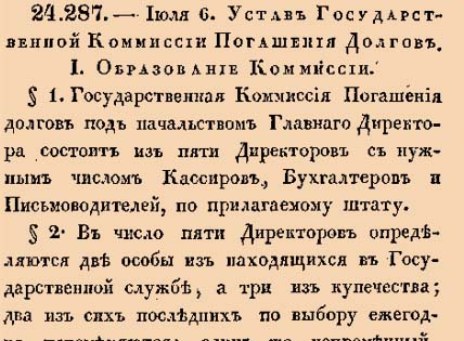 24287. 1810 год. 18 июля (6 июля ст.ст.). Устав Государственной Комиссии Погашения Долгов.<…> Государственная Комиссия Погашения Долгов под начальством Главного Директора состоит из пяти Директоров с нужным числом Кассиров, Бухгалтеров и письмоводителей по прилагаемому штату <…>