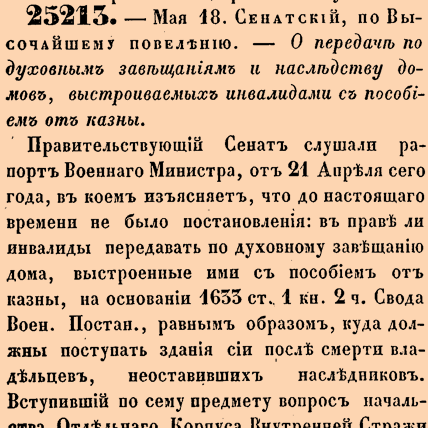 25213. 1851 год. 30 мая (18 мая ст.ст.). Сенатский, по Высочайшему повелению. О передаче по духовным завещаниям и наследству домов, выстроиваемых инвалидами с пособием от казны.Правительствующий Сенат слушали рапорт Военнаго Министра, от 21 Апреля сего года, в коем изъясняет, что до настоящаго времени не было постановления: в праве ли инвалиды передавать по духовному завещанию дома, выстроенные ими с пособием от казны, на основании 1633 ст., 1 кн. 2 ч. Свода Военных Постановлений, равным образом куда должны поступать здания сии после смерти владельцев, неоставивших наследников <…>
