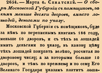 Московской Губерніи съ помѣщиковъ, буде за кѣмъ по переписнымъ книгамъ 186 году, меньше 10 дворовъ, и съ тѣхъ за лошадей имать деньгами по указу, въ какову цѣну тѣхъ лошадей покупать велѣно, росчитая по дворовому числу; а за которыми больше 10 дворовъ, и тѣмъ по прежнему и по сему Его Великаго Государя указамъ платитъ лошадями; а денегъ съ нихъ не иматъ; и о томъ въ Московскую Губернію послать Его Великаго Государя указъ.