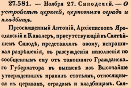 Преосвященный Антоний, Архиепископ Ярославский и Кавалер, присутствующий в Святейшем Синоде, представлял оному, испрашивая разрешения, в разсуждении исполнения по сообщенным ему от тамошняго Гражданскаго Губернатора в выписке из Высочайше утвержденных правил статьями, относящимися к церквам, оградам и кладбищам <…>