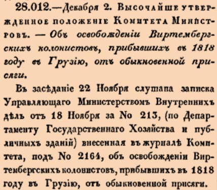 28012. 1819 год. 14 декабря (2 декабря ст.ст.) Высочайше утвержденное положение Комитета Министров. Об освобождении Виртембергских колонистов, прибывших в 1818 году в Грузию, от обыкновенной присяги.<…> Комитет полагал: утвердить сие представление, вспросив на то предварительно Высочайшее соизволение. В заседание 2 Декабря Комитету объявлено, что Государь Император на сие соизволяет <…>