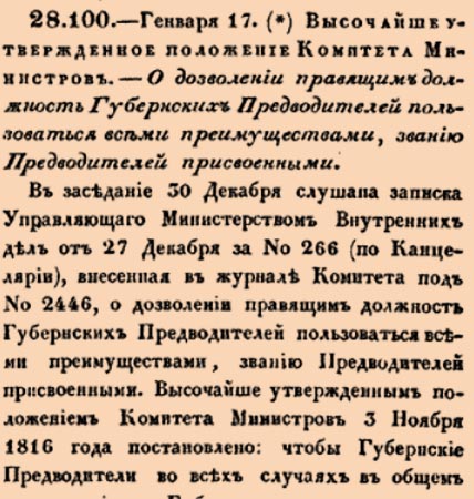 28100. 1820 год. 17 января (29 января). Высочайше утвержденное положение Комитета Министров. О дозволении правящим должность Губернских Предводителей пользоваться всеми преимуществами, званию Предводителей присвоенными.