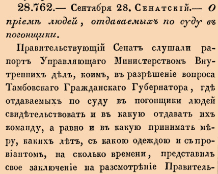28762. 1821 год. 10 октября (28 сентября ст.ст.) Сенатский. О приеме людей, отдаваемых по суду в погонщики.Правительствующий Сенат слушали рапорт Управляющаго Министерством Внутренних дел, коим, в разрешение вопроса Тамбовскаго Гражданскаго Губернатора, где отдаваемых по суду в погонщики людей свидетельствовать и в какую отдавать их команду, а равно и в какую принимать меру, каких лет, с какою одеждою и с провиантом <…>