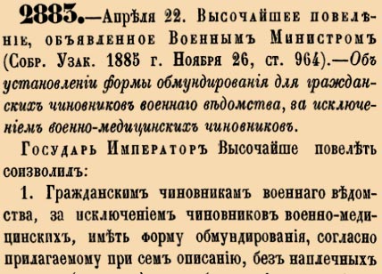2883. 1885 год. 22 апреля (4 мая). Высочайшее повеление, объявленное Военным Министром. Об установлении формы обмундирования для гражданских чиновников военнаго ведомства, за исключением военно-медицинских чиновников.