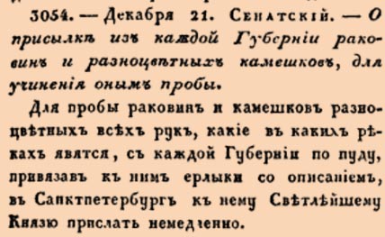 Для пробы раковин и камешков разноцветных всех рук, какие в каких реках явятся, с каждой Губернии по пуду, привязав к ним ерлыки с описанием, в Санктпетербург к нему Светлейшему Князю прислать немедленно.