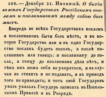 Вперед во всех Государствах послом и посланникам бытии без мест, и в которое Государство или и в одно Государство послан будет посол, а после посланник или гонец: и посланнику до посла дела нет, и тем им меж себя не укоряться, и в случаи не ставить и не подавать, и в привод того не приводить; и тот свой Государев указ указал Государь записать в Посольском приказе и в Розряде.