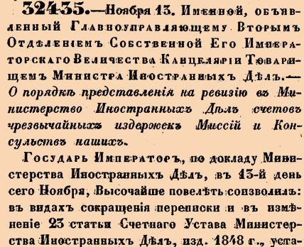 Государь Император, по докладу Министерства Иностранных Дел, в 13-й день сего Ноября, Высочайше повелеть соизволил: в видах сокращения переписки и в изменение 23 статьи Счетнаго Устава Министерства Иностранных Дел, изд. 1848 г., установить общий порядок для доставления сему Министерству счетов чрезвычайных издержек, и предоставить впредь Миссиям и Консульствам нашим на Востоке представлять свои счета помянутым издержкам на ревизию, не чрез Азиятский Департамент, как указано вышеприведенною статьею, а непосредственно в Департамент Хозяйственных и Счетных Дел, подобно тому, как оные доставляются от Миссий и Консульств наших в Европе и Америке.