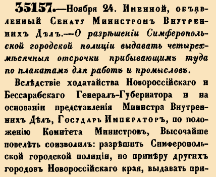 35157. 1859 год. 24 ноября (6 декабря). Именной, объявленный Сенату Министром Внутренних Дел. О разрешении Симферопольской городской полиции выдавать четырехмесячные отсрочки прибывающим туда по плакатам для работ и промыслов